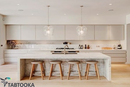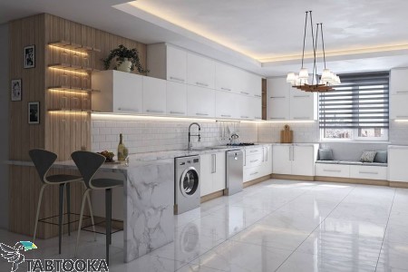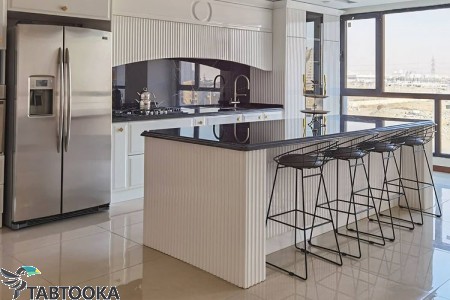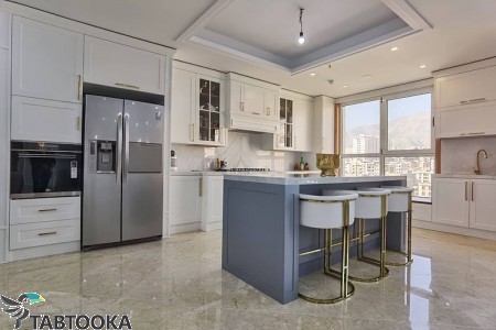 طراحی واجرای کابینت آشپزخانه نئوکلاسیک درب ونما پلی اورتان صفحه وبین کابینت سنگ طبیعی