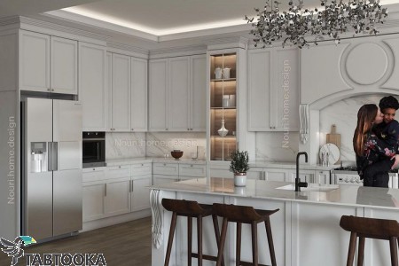 طراحی واجرای کابینت آشپزخانه نئوکلاسیک درب ونما پلی اورتان صفحه وبین کابینت سنگ طبیعی